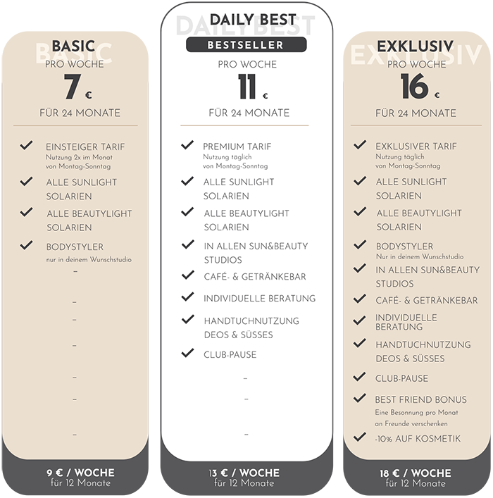 Keine versteckten Kosten. Kein Aufpreis für BeautyLight / Collagen und neue Bräunungsgeräte. Wir rechnen den Wochenpreis nur x 4 = Monatspreis. Viele Anbieter rechnen x 4,3.